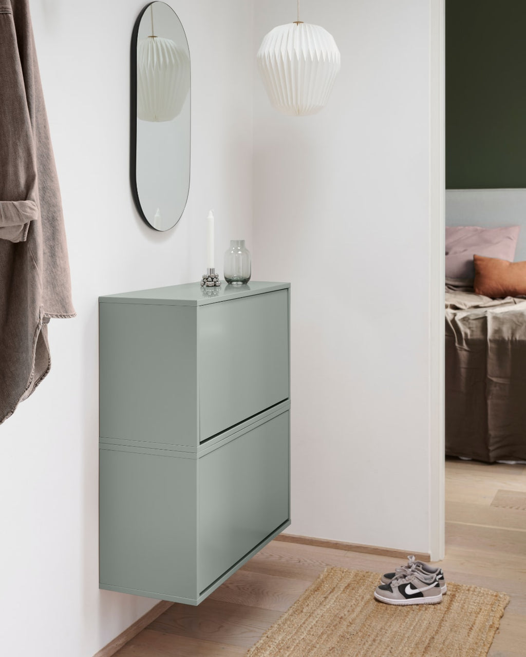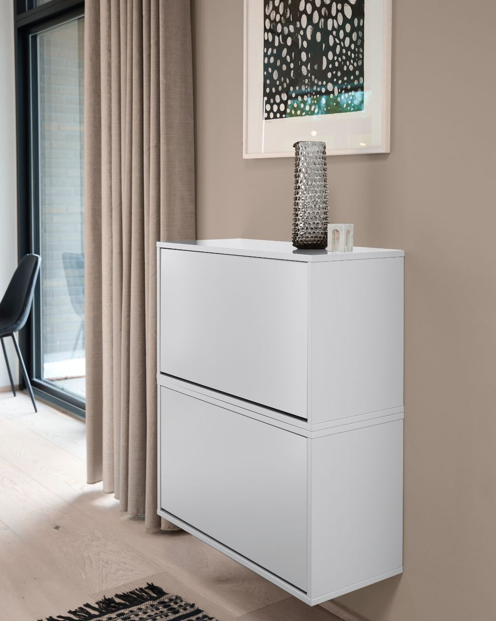 Kassen er væghængt, hvilket betyder, at den ikke optager gulvplads og gør rengøringen nem. Du kan stable kasserne oven på hinanden, placere dem side om side eller arrangere dem på enhver måde, der passer til din stil og dit hjem. Kombiner dem med vores andre opbevaringskasser, som deler samme design og farveunivers, og skab en personlig opbevaringsvæg, der afspejler din smag.